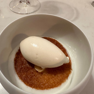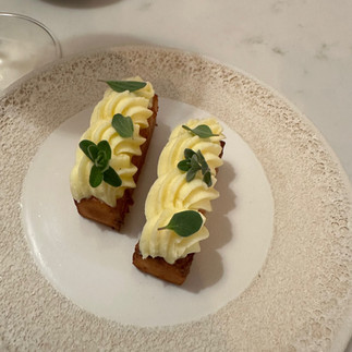 Jerusalem artichoke and white chocolate, caramel and almond Madeleine and lemon cream